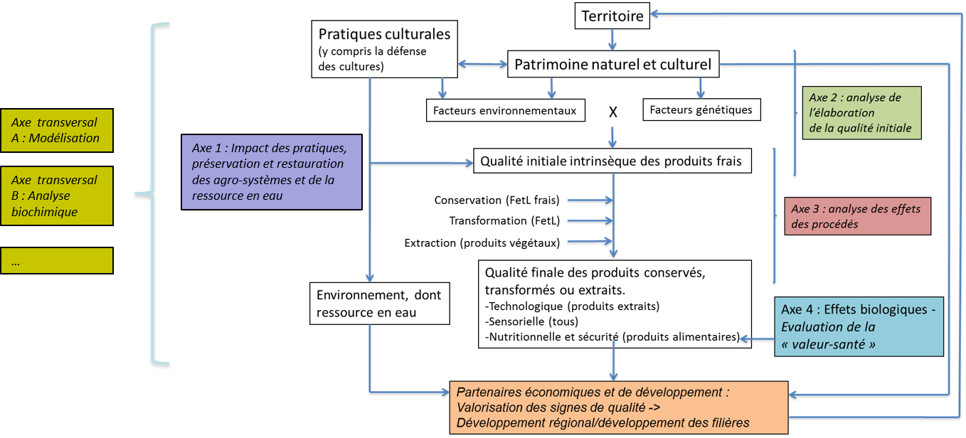 L’axe 2 a pour objectif l’étude de l’impact qu’ont les facteurs environnementaux, au sens large, en relation avec les facteurs génétiques, sur la qualité des produits frais. L‘axe 3 s’intéresse aux effets des procédés sur la qualité des produits végétaux conservés, transformés ou extraits.